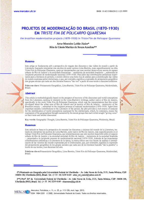 Este artigo se fundamenta sob a perspectiva de resgate dos discursos e das visões de mundo a partir da Literatura, buscando interpretar nos escritos do autor carioca Lima Barreto, mais especificamente na obra Triste Fim de Policarpo Quaresma, quais as interpretações que esse escritor desenvolveu acerca do espaço urbano do Rio de Janeiro e da sociedade fluminense – metonímia da sociedade brasileira –, submetida ao incipiente processo de modernização nacional (1870-1930). Para além das contribuições estilísticas importantes para a literatura do período, o enredo oferece uma fonte rica de análise para a identificação das visões de mundo expressas pelos intelectuais, o que, por extensão, significa a expressão do pensamento geográfico dos grupos sociais que cada um dos literatos buscava “dar voz” a partir de seus textos e discursos artísticos.