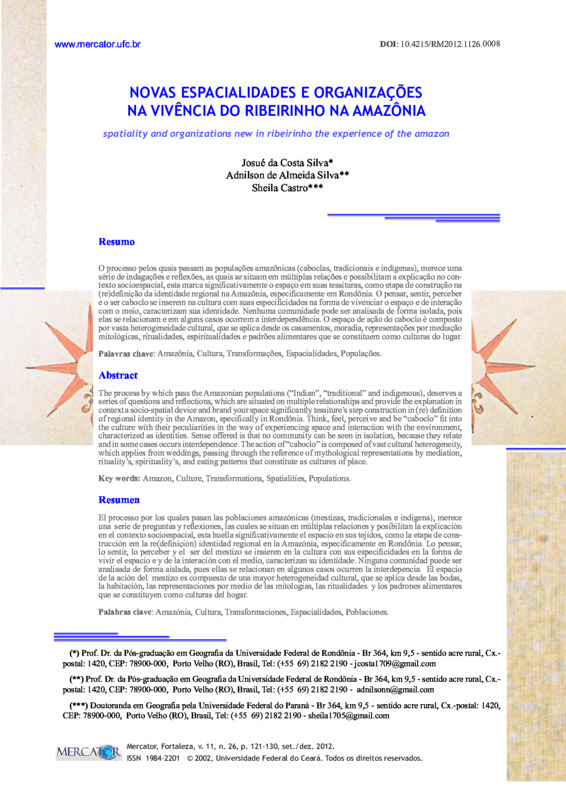O processo pelos quais passam as populações amazônicas (caboclas, tradicionais e indígenas), merece uma série de indagações e reflexões, as quais se situam em múltiplas relações e possibilitam a explicação no contexto socioespacial, esta marca significativamente o espaço em suas tessituras, como etapa de construção na (re)definição da identidade regional na Amazônia, especificamente em Rondônia. O pensar, sentir, perceber e o ser caboclo se inserem na cultura com suas especificidades na forma de vivenciar o espaço e de interação com o meio, caracterizam sua identidade. Nenhuma comunidade pode ser analisada de forma isolada, pois elas se relacionam e em alguns casos ocorrem a interdependência. O espaço de ação do caboclo é composto por vasta heterogeneidade cultural, que se aplica desde os casamentos, moradia, representações por mediação mitológicas, ritualidades, espiritualidades e padrões alimentares que se constituem como culturas do lugar.
