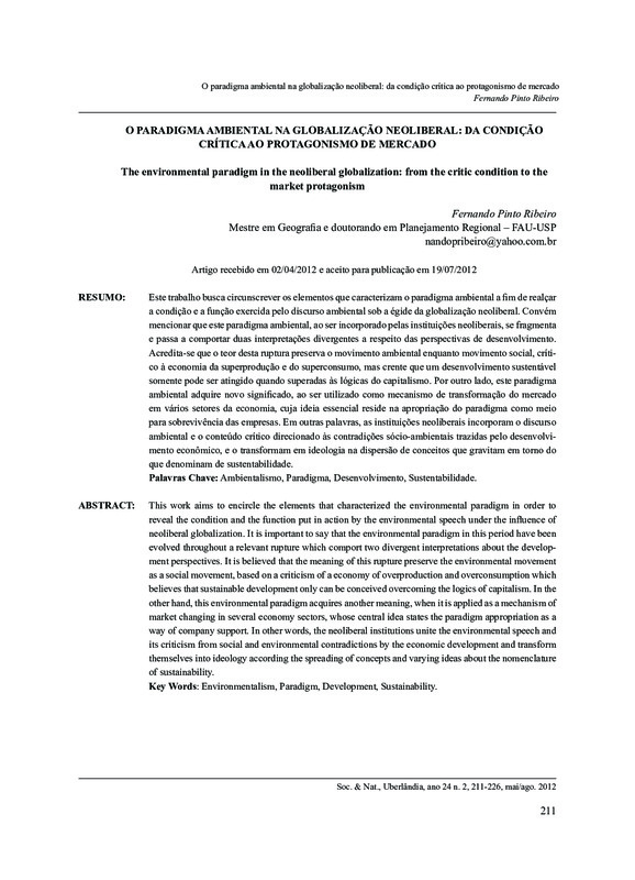 O paradigma ambiental na globalização neoliberal: da condição crítica ao protagonismo de mercado / The environmental paradigm in the neoliberal globalization: from the critic condition to the market protagonism