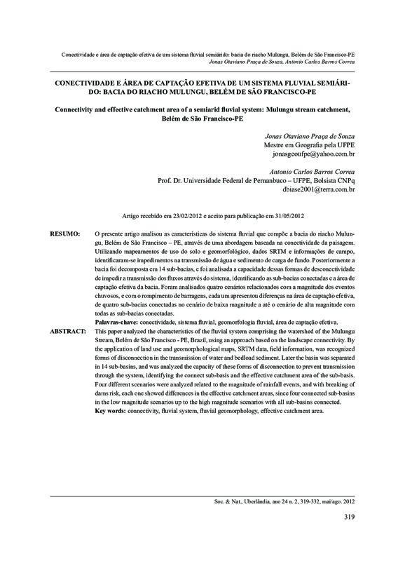 Conectividade e área de captação efetiva de um sistema fluvial semiárido: bacia do riacho Mulungu, Belém de São Francisco-PE / Connectivity and effective catchment area of a semiarid fluvial system: Mulungu stream catchment, Belém de São Francisco-PE