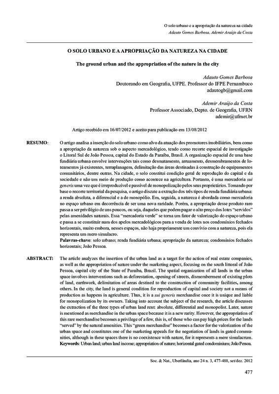 O artigo analisa a inserção do solo urbano como alvo da atuação dos promotores imobiliários, bem como a apropriação da natureza sob o aspecto mercadológico, tendo como recorte espacial de investigação o Litoral Sul de João Pessoa, capital do Estado da Paraíba, Brasil. A organização espacial de uma base fundiária urbana envolve intervenções tais como desmatamento, arruamento, desmembramentos de loteamentos já existentes, terraplanagem, delimitação das áreas destinadas à construção de equipamentos comunitários, dentre outras. Na cidade, o solo constitui condição geral de reprodução do capital e da sociedade e não um meio de produção como acontece na agricultura. Portanto, é uma mercadoria sui generis uma vez que é irreproduzível e passível de monopolização pelos seus proprietários. Tomando por base o recorte territorial da pesquisa, o artigo discute a extração dos três tipos de renda fundiária urbana: a renda absoluta, a diferencial e a de monopólio. Em, seguida, a natureza é abordada como mercadoria no espaço urbano em decorrência de ser uma nova raridade. Porém, a apropriação desse produto raro passa a ser privilégio de uns poucos, ou seja, daqueles que podem pagar o alto preço dos lotes “servidos” pelas amenidades naturais. Essa “mercadoria verde” se torna um fator de valorização do espaço urbano e passa a se constituir num dos apelos mercadológicos para a venda de lotes nos condomínios fechados horizontais, muito embora, nesses espaços, não haja propriamente um convívio com a natureza, pois ela representa um mero simulacro.