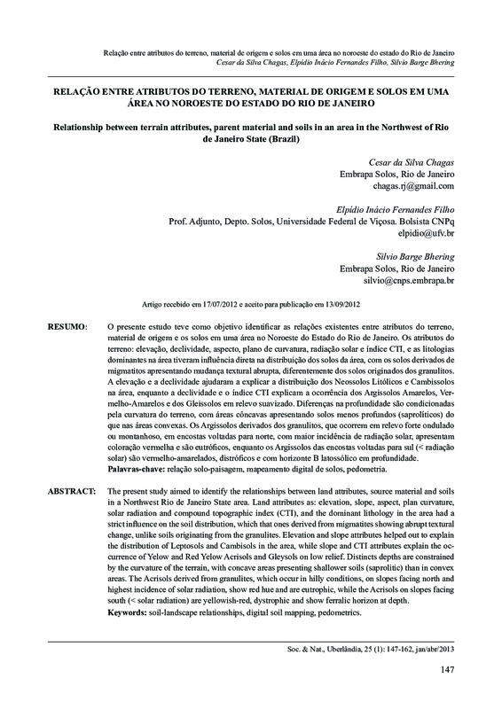 O presente estudo teve como objetivo identificar as relações existentes entre atributos do terreno, material de origem e os solos em uma área no Noroeste do Estado do Rio de Janeiro. Os atributos do terreno: elevação, declividade, aspecto, plano de curvatura, radiação solar e índice CTI, e as litologias dominantes na área tiveram influência direta na distribuição dos solos da área, com os solos derivados de migmatitos apresentando mudança textural abrupta, diferentemente dos solos originados dos granulitos. A elevação e a declividade ajudaram a explicar a distribuição dos Neossolos Litólicos e Cambissolos na área, enquanto a declividade e o índice CTI explicam a ocorrência dos Argissolos Amarelos, Vermelho-Amarelos e dos Gleissolos em relevo suavizado. Diferenças na profundidade são condicionadas pela curvatura do terreno, com áreas côncavas apresentando solos menos profundos (saprolíticos) do que nas áreas convexas. Os Argissolos derivados dos granulitos, que ocorrem em relevo forte ondulado ou montanhoso, em encostas voltadas para norte, com maior incidência de radiação solar, apresentam coloração vermelha e são eutróficos, enquanto os Argissolos das encostas voltadas para sul (< radiação solar) são vermelho-amarelados, distróficos e com horizonte B latossólico em profundidade.