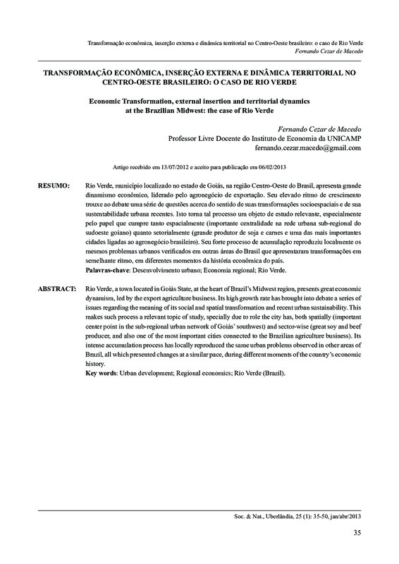 Rio Verde, cidade localizada no estado de Goiás, na região Centro-Oeste do Brasil, apresenta grande dinamismo econômico, liderado pelo agronegócio de exportação. Seu elevado ritmo de crescimento trouxe ao debate uma série de questões acerca do sentido de suas transformações socioespaciais e de sua sustentabilidade urbana recentes. Isto torna tal processo um objeto de estudo relevante, especialmente pelo papel que a cidade cumpre tanto espacialmente (importante centralidade na rede urbana sub-regional do sudoeste goiano) quanto setorialmente (grande produtor de soja e carnes e uma das mais importantes cidades ligadas ao agronegócio brasileiro). Seu forte processo de acumulação reproduziu localmente os mesmos problemas urbanos verificados em outras áreas do Brasil que apresentaram transformações em semelhante ritmo, em diferentes momentos da história econômica do país.