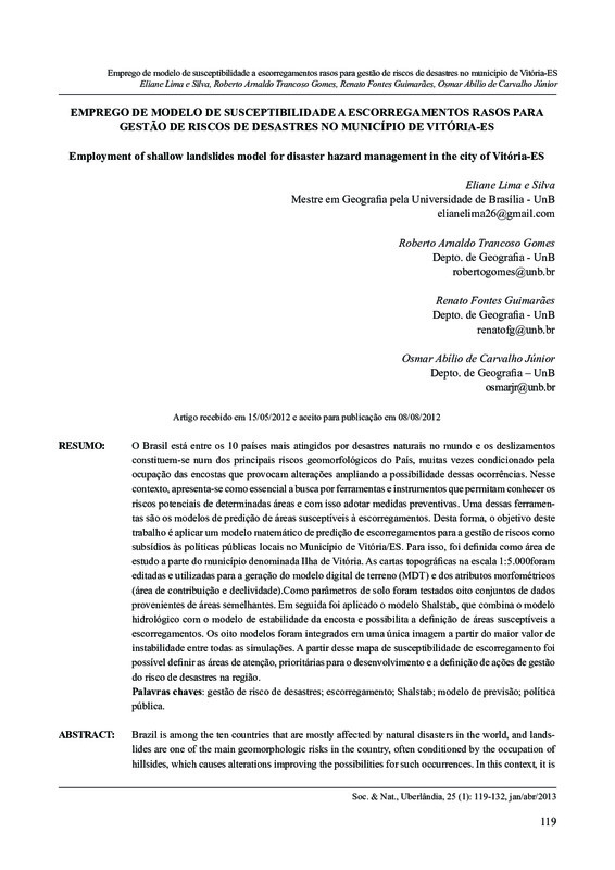 Emprego de modelo de susceptibilidade a escorregamentos rasos para gestão de riscos de desastres no município de Vitória-ES / Employment of shallow landslides model for disaster hazard management in the city of Vitória-ES
