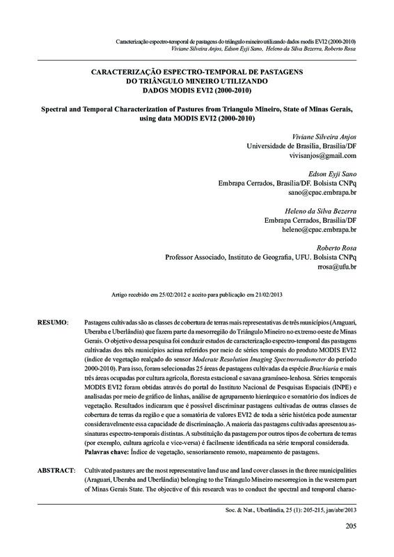 Pastagens cultivadas são as classes de cobertura de terras mais representativas de três municípios (Araguari, Uberaba e Uberlândia) que fazem parte da mesorregião do Triângulo Mineiro no extremo oeste de Minas Gerais. O objetivo dessa pesquisa foi conduzir estudos de caracterização espectro-temporal das pastagens cultivadas dos três municípios acima referidos por meio de séries temporais do satélite MODIS EVI2 (índice de vegetação realçado do sensor Moderate Resolution Imaging Spectrorradiometer do período 2000-2010). Para isso, foram selecionadas 25 áreas de pastagens cultivadas da espécie Brachiaria e mais três áreas ocupadas por cultura agrícola, floresta estacional e savana gramíneo-lenhosa. Séries temporais do MODIS EVI2 foram obtidas do portal do Instituto Nacional de Pesquisas Espaciais (INPE) e analisadas por meio de gráfico de linhas, análise de agrupamento hierárquico e somatório dos índices de vegetação. Resultados indicaram que é possível discriminar pastagens cultivadas de outras classes de cobertura de terras da região e que a somatória de valores de EVI2 de toda a série histórica pode aumentar consideravelmente essa capacidade de discriminação. A maioria das pastagens cultivadas apresentaram assinaturas espectro-temporais distintas. A substituição da pastagem por outros tipos de cobertura de terras (por exemplo, cultura agrícola e vice-versa) é facilmente identificada na série temporal considerada.