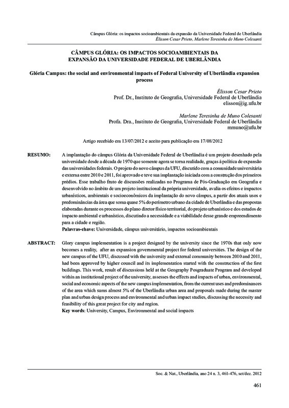 Câmpus Glória: os impactos socioambientais da expansão da Universidade Federal de Uberlândia / Glória Campus: the social and environmental impacts of Federal University of Uberlândia expansion process