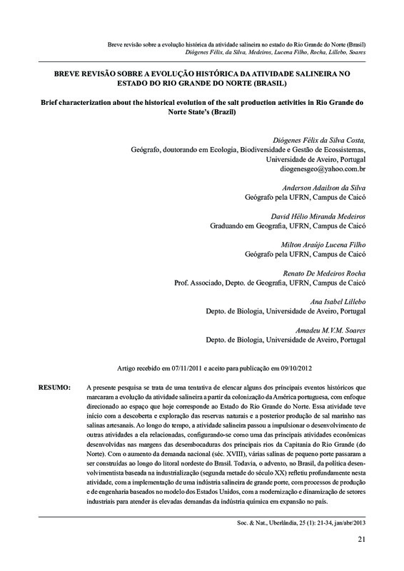 Breve revisão sobre a evolução histórica da atividade salineira no estado do Rio Grande do Norte (Brasil) / Brief characterization about the historical evolution of the salt production activities in Rio Grande do Norte State’s (Brazil)