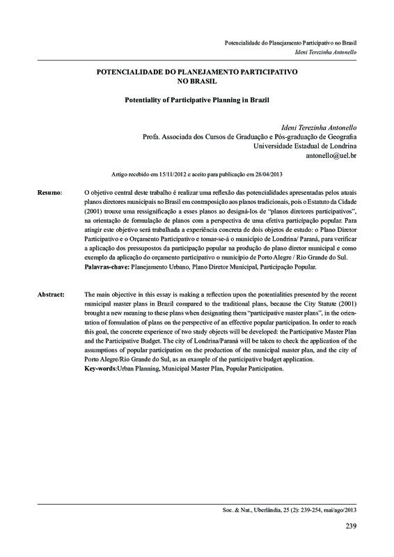 O objetivo central deste trabalho é realizar uma reflexão das potencialidades apresentadas pelos atuais planos diretores municipais no Brasil em contraposição aos planos tradicionais, pois o Estatuto da Cidade (2001) trouxe uma ressignificação a esses planos ao designá-los de “planos diretores participativos”, na orientação de formulação de planos com a perspectiva de uma efetiva participação popular. Para atingir este objetivo será trabalhada a experiência concreta de dois objetos de estudo: o Plano Diretor Participativo e o Orçamento Participativo e tomar-se-á o município de Londrina/ Paraná, para verificar a aplicação dos pressupostos da participação popular na produção do plano diretor municipal e como exemplo da aplicação do orçamento participativo o município de Porto Alegre / Rio Grande do Sul.