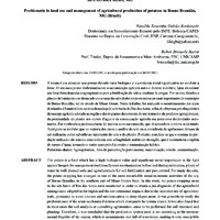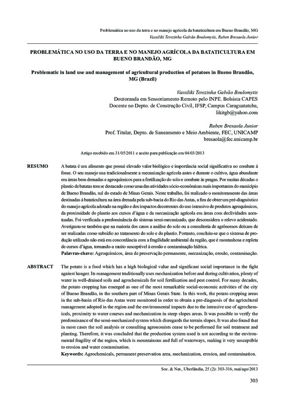 No município de Bueno Brandão, sul de MG, o plantio de batatas vem sendo uma atividade sócio-econômica importante por muitas décadas. O uso intensivo de agroquímicos é uma das características principais do seu manejo. Neste trabalho, algumas propriedades foram registradas na parte interna ou em áreas próximas à sub-bacia do Rio das Antas, a fim de compreender como o uso da terra e da produção agrícola acontece. Alguns dos dados avaliados foram: a localização de cada plantação, se foram desenvolvidas dentro ou fora de áreas de preservação permanente ao redor de cursos d’água; o tipo e a quantidade de agroquímicos utilizado pelos fazendeiros; se eles haviam enviado amostras do solo para o laboratório previamente a fim de determinar os tipos e quantidades de nutrientes que a terra de fato necessitava; e também, o sistema de produção utilizado, manual ou mecanizado. Por fim foi observado, como na hipótese original, que mesmo sendo tradicional na região, a bataticultura apresenta inadequação no uso da terra e no sistema de produção, nos quais intensas e não necessárias dosagens de agroquímicos são aplicadas, e muitas plantações são localizadas dentro de áreas de preservação ou próximas de rios e nascentes.