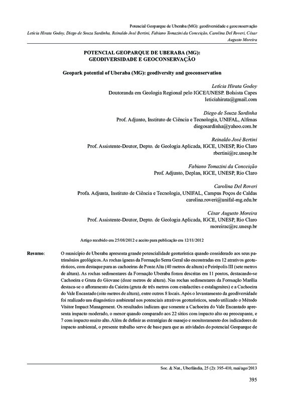 O Município de Uberaba apresenta grande potencialidade geoturística em relação aos seus patrimônios geológicos. As rochas ígneas da Formação Serra Geral são encontradas em 12 atrativos geoturísticos, com destaque para as cachoeiras de Ponte Alta (40 metros de altura) e Peirópolis III (7 metros de altura). As rochas sedimentares da Formação Uberaba foram descritas em 11 atrativos geoturísticos, destacando-se Cachoeira e Gruta do Giovane (12 metros de altura). Nas rochas sedimentares da Formação Marília destaca-se o afloramento da Caieira (gruta de três metros com estalactites e estalagmites) e a Cachoeira do Vale Encantado (8 metros de altura), entre outros 8 atrativos. Após o levantamento da geodiversidade foi realizado um diagnóstico ambiental nos atrativos geoturísticos, sendo utilizado o Método Visitor Impact Management. Os resultados indicam que somente a Cachoeira do Vale Encantado apresenta impacto moderado, o menor quando comparado aos 22 atrativos com impacto alto ou preocupante, e 7 atrativos com impacto muito alto. Além de definir as estratégias de manejo e monitoramento dos indicadores de impacto ambiental, o presente trabalho serve de base para que as atividades do potencial Geoparque de Uberaba (MG) sejam realizadas com responsabilidade ambiental e/ou geoconservação.