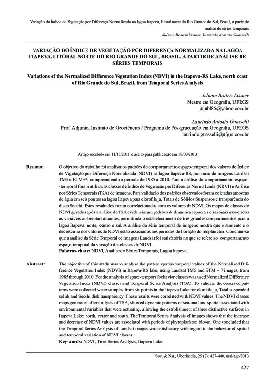 Variação do Índice de Vegetação por Diferença Normalizada na lagoa Itapeva, litoral norte do Rio Grande do Sul, Brasil, a partir de análise de séries temporais / Variations of the Normalized Difference Vegetation Index (NDVI) in the Itapeva-RS Lake, .....