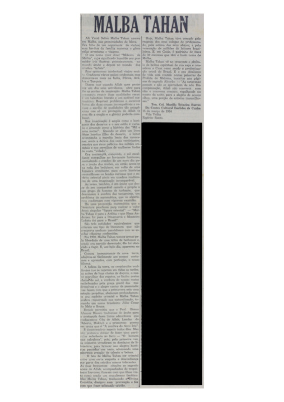 Malba Tahan. Interpretação meio fantasista da biografia do prof. Júlio César de Melo e Souza. Ou será que ele acreditava, mesmo, que este era um árabe naturalizado brasileiro?