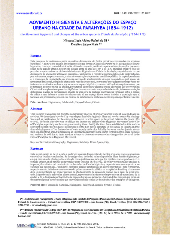 MOVIMENTO HIGIENISTA E ALTERAÇÕES DO ESPAÇO URBANO NA CIDADE DA PARAHYBA (1854-1912) (the Movement Hygienist and changes of the urban space in Cidade da Parahyba -1854/1912)