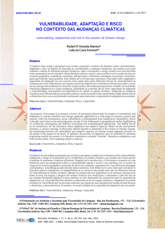 O objetivo deste artigo é apresentar uma revisão conceitual e analítica da literatura sobre vulnerabilidade, adaptação e risco no âmbito da discussão da variabilidade e mudanças climáticas, que poderá servir para embasar a análise de diferentes perigos climáticos. Após a introdução, o artigo começa com uma distinção entre as perspectivas em relação à vulnerabilidade natural e social e suas interfaces com a noção de risco no contexto geográfico, ressaltando confusões, sobreposições e diferentes estratégias conceituais e metodológicas para abordar essas questões. Esse debate serve de base para introduzir a discussão sobre adaptação e capacidade de adaptação em um contexto mais amplo dado pelas diferentes formas de vulnerabilidade às mudanças do clima. Baseando-se em estudos anteriores disponíveis na literatura internacional sobre o tema, riscos e perigos das mudanças do clima são categorizados e discutidos para posicionar o desafio de localidades brasileiras adaptarem-se a essas mudanças, ressaltando as conexões não só entre capacidade de adaptação e vulnerabilidade, mas também sua dependência em relação ao perigo climático. Adaptação às mudanças climáticas será influenciada por processos externos, sendo necessária uma consideração ampla desses fatores e obstáculos, bem como sua dimensão multiescalar para determinar a capacidade de adaptação da sociedade.