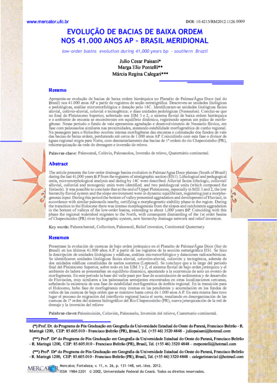 Apresenta-se evolução de bacias de baixa ordem hierárquica no Planalto de Palmas/Água Doce (sul do Brasil) nos 41.000 anos AP a partir de registros de seção estratigráfica. Descreveu-se unidades litológicas e pedológicas, análise micromorfológica e datação pelo 14C. Identificaram-se unidades litológicas fácies aluvial, colúvio-aluvial, coluvial e tecnogênica; e duas unidades pedológicas (Neossolos). Conclui-se que no final do Pleistoceno Superior, sobretudo nos EIM 3 e 2, o sistema fluvial de baixa ordem hierárquica e o ambiente de encosta se encontravam em equilíbrio dinâmico, registrando apenas um pulso de morfogênese. Nesse período o fundo de vale apresentou agradação e desenvolvimento de Neossolo flúvico, em fase com paleossolos similares nas proximidades, atestando estabilidade morfogenética de cunho regional. Na passagem para o Holocêno ocorreu intensa morfogênese das encostas e colmatação dos fundos de vale das bacias de baixa ordem, perdurando até cerca de 1.000 anos AP. Coincidindo com esta fase o divisor de águas regional migra para Norte, com desmantelamento das bacias de 1ª ordem do rio Chapecózinho (PR), rehierarquização da rede de drenagem e inversão de relevo.