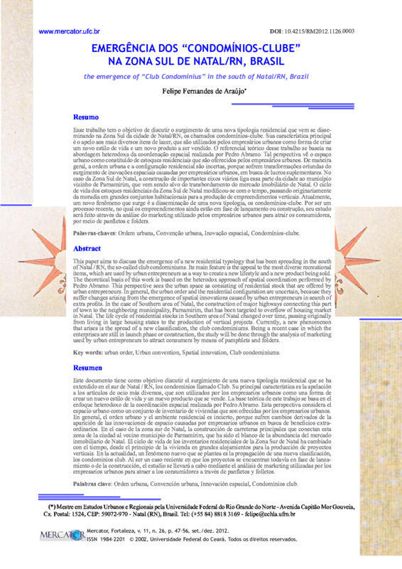 Esse trabalho tem o objetivo de discutir o surgimento de uma nova tipologia residencial que vem se disseminando na Zona Sul da cidade de Natal/RN, os chamados condomínios-clube. Sua característica principal é o apelo aos mais diversos itens de lazer, que são utilizados pelos empresários urbanos como forma de criar um novo estilo de vida e um novo produto a ser vendido. O referencial teórico desse trabalho se baseia na abordagem heterodoxa da coordenação espacial realizada por Pedro Abramo. Tal perspectiva vê o espaço urbano como constituído de estoques residenciais que são oferecidos pelos empresários urbanos. De maneira geral, a ordem urbana e a configuração residencial são incertas, porque sofrem transformações oriundas do surgimento de inovações espaciais causadas por empresários urbanos, em busca de lucros suplementares. No caso da Zona Sul de Natal, a construção de importantes eixos viários liga essa parte da cidade ao município vizinho de Parnamirim, que vem sendo alvo do transbordamento do mercado imobiliário de Natal. O ciclo de vida dos estoques residenciais da Zona Sul de Natal modificou-se com o tempo, passando originariamente da moradia em grandes conjuntos habitacionais para a produção de empreendimentos verticais. Atualmente, um novo fenômeno que surge é a disseminação de uma nova tipologia, os condomínios-clube. Por ser um processo recente, no qual os empreendimentos ainda estão em fase de lançamento ou construção, seu estudo será feito através da análise do marketing utilizado pelos empresários urbanos para atrair os consumidores, por meio de panfletos e folders.