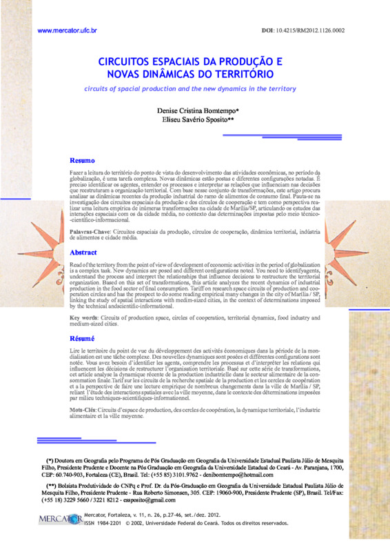 Fazer a leitura do território do ponto de vista do desenvolvimento das atividades econômicas, no período da globalização, é uma tarefa complexa. Novas dinâmicas estão postas e diferentes configurações notadas. É preciso identificar os agentes, entender os processos e interpretar as relações que influenciam nas decisões que reestruturam a organização territorial. Com base nesse conjunto de transformações, este artigo procura analisar as dinâmicas recentes da produção industrial do ramo de alimentos de consumo final. Pauta-se na investigação dos circuitos espaciais da produção e dos círculos de cooperação e tem como perspectiva realizar uma leitura empírica de inúmeras transformações na cidade de Marília/SP, articulando os estudos das interações espaciais com os da cidade média, no contexto das determinações impostas pelo meio técnico-científico-informacional.