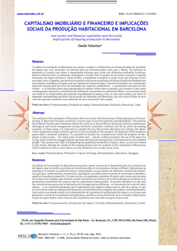 A análise da metrópole de Barcelona nos ajuda a compor a problemática da financeirização da produção do espaço que vem ocorrendo nos últimos anos em diversos países, entre eles o Brasil. Tal processo se apresenta no mundo com ritmos e intensidades distintas, pois conta com diferentes mediações históricas, político-institucionais, econômicas, ideológicas e sociais entre os países de economia avançada e aqueles chamados em desenvolvimento. Neste sentido, é importante considerar o modo como este processo ocorre num país como a Espanha, que apoiou seu grande crescimento econômico da última década nos fundamentos da produção imobiliária do espaço sob um capitalismo financeirizado. É possível identificar as contradições presentes naquele país em torno da realização dos negócios imobiliários – a valorização crescente do solo urbano – e os embates postos pela apropriação do espaço urbano para a moradia, que revelam a luta contra a expropriação financeira e imobiliária dos habitantes mais pobres ou sobreendividados. Este caminho pode nos auxiliar na interpretação da produção mundializada do espaço, lida, no caso aqui tratado, por meio da expansão metropolitana periférica da produção da habitação em Barcelona, que nos coloca diante de uma crise não apenas econômica mas sobretudo de uma crise social mais ampla.