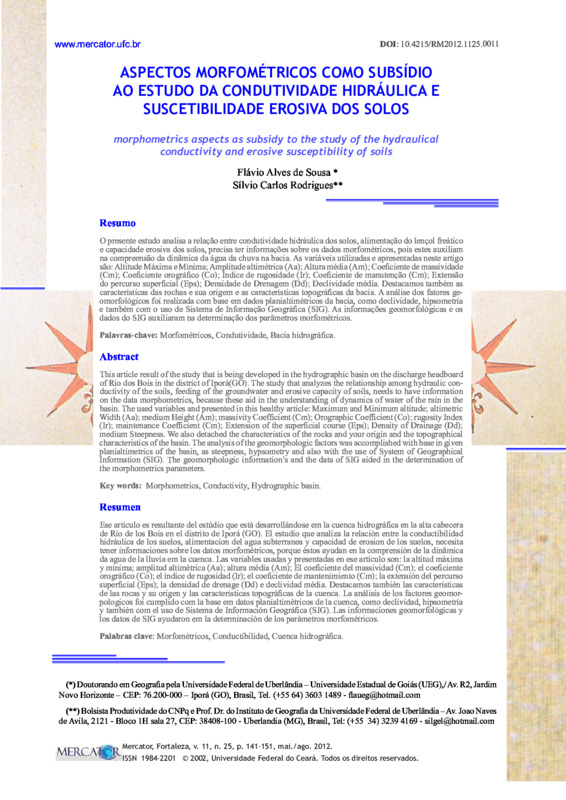 ASPECTOS MORFOMÉTRICOS COMO SUBSÍDIO AO ESTUDO DA CONDUTIVIDADE HIDRÁULICA E SUSCETIBILIDADE EROSIVA DOS SOLOS (morphometrics aspects as subsidy to the study of the hydraulical conductivity and erosive susceptibility of soils)