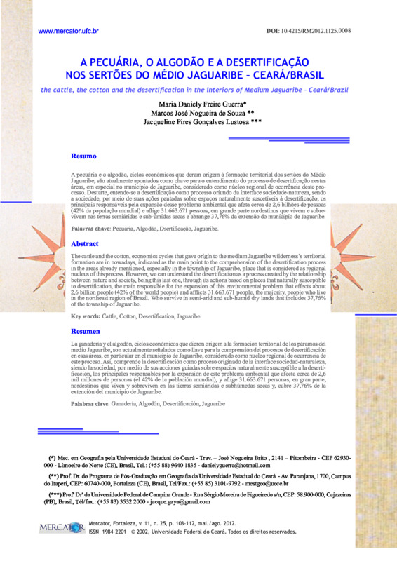 A PECUÁRIA, O ALGODÃO E A DESERTIFICAÇÃO NOS SERTÕES DO MÉDIO JAGUARIBE – CEARÁ/BRASIL (the cattle, the cotton and the desertification in the interiors of Medium Jaguaribe – Ceará/Brazil)