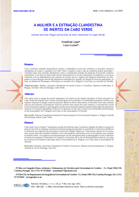 Com o presente trabalho pretendemos avaliar a importância social das mulheres no processo extrativo clandestino de areias e cascalhos em Cabo Verde e explicar como é que as mulheres podem participar e contribuir para uma extração sustentável e para a consequente redução de impactes do processo extrativo clandestino. Com base na observação direta e participativa no terreno realizaram-se inquéritos e conversas informais com as trabalhadoras que extraem os inertes, fez-se o registo dos impactes ambientais em fotografia e a sua avaliação através das matrizes de interação de Leopold, em função do local da exploração, no caso, as ribeiras de Flamengos e Principal, no concelho de S. Miguel e a de Cuba, no concelho de Tarrafal.