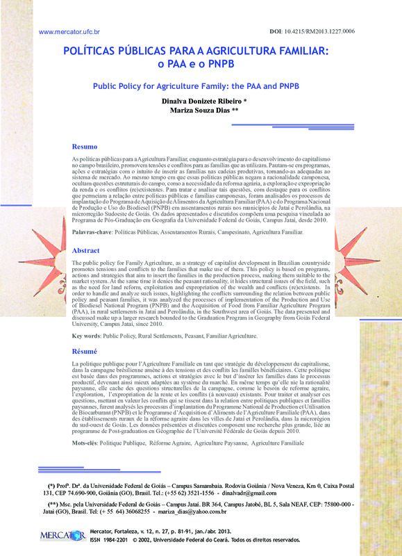 POLÍTICAS PÚBLICAS PARA A AGRICULTURA FAMILIAR: o PAA e o PNPB (Public Policy for Agriculture Family: the PAA and PNPB)
