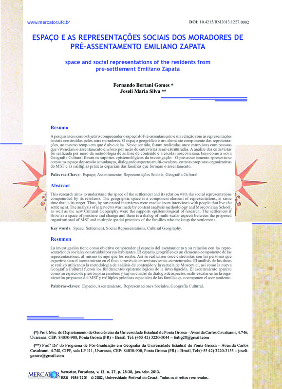 ESPAÇO E AS REPRESENTAÇÕES SOCIAIS DOS MORADORES DE PRÉ-ASSENTAMENTO EMILIANO ZAPATA (space and social representations of the residents from pre-settlement Emiliano Zapata)