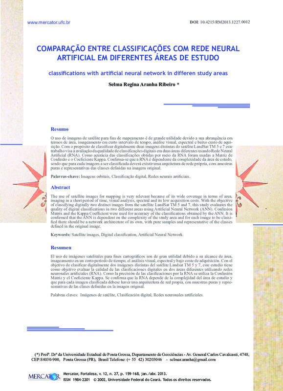 Artificial (RNA). Como acurácia das classificações obtidas por meio da RNA foram usadas a Matriz de