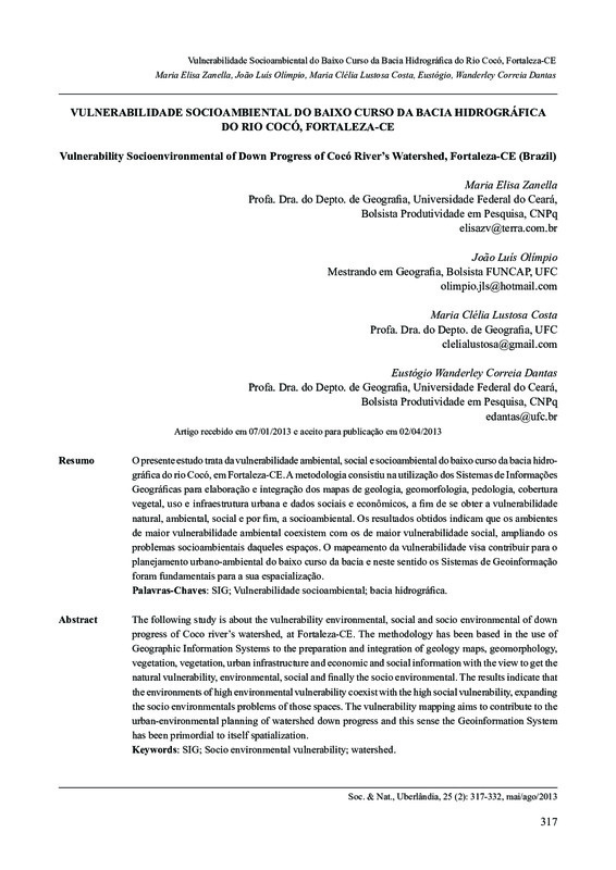 Vulnerabilidade Socioambiental do Baixo Curso da Bacia Hidrográfica do Rio Cocó, Fortaleza-CE / Vulnerability Socioenvironmental of Down Progress of Cocó River’s Watershed, Fortaleza-CE (Brazil)