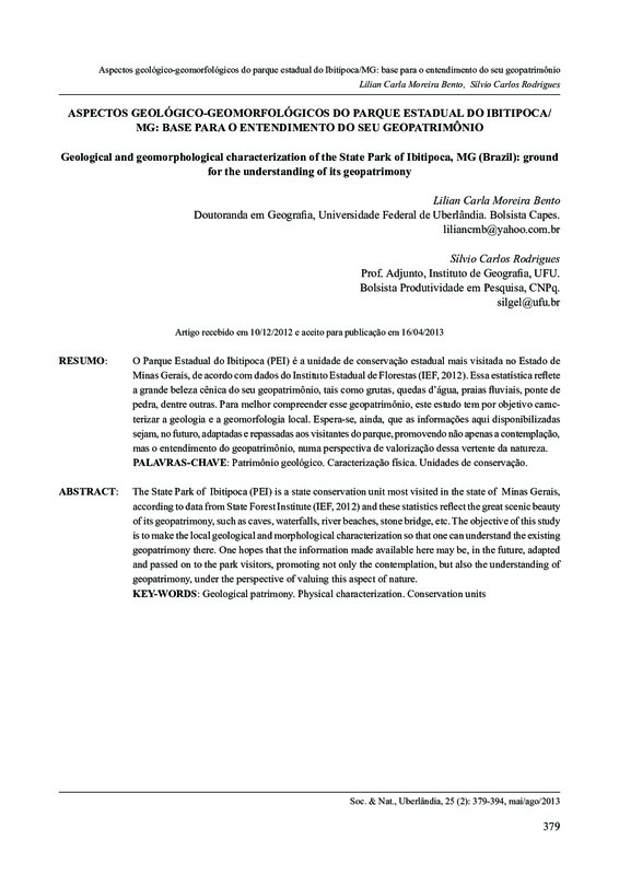 O Parque Estadual do Ibitipoca (PEI) é a unidade de conservação estadual mais visitada no Estado de Minas Gerais, de acordo com dados dos IEF – Instituto Estadual de Florestas (2012) e essa estatística vem refletir a grande beleza cênica do seu geopatrimônio, tais como grutas, quedas d’água, praias fluviais, ponte de pedra etc. O objetivo desse estudo é efetuar a caracterização da geologia e do relevo local, de forma a compreender o geopatrimônio lá existente. Espera-se que as informações aqui disponibilizadas sejam, no futuro, adaptadas e repassadas aos visitantes do parque, promovendo não apenas a contemplação, mas o entendimento do geopatrimônio, numa perspectiva de valorização dessa vertente da natureza.