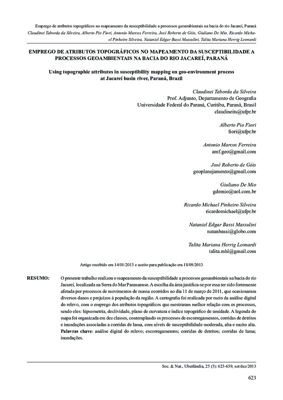 Emprego de atributos topográficos no mapeamento da susceptibilidade a processos geoambientais na bacia do rio Jacareí, Paraná / Using topographic attributes in susceptibility mapping on geo-environment process at Jacareí basin river, Paraná, Brazil