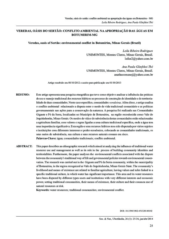 Veredas, oásis do sertão: conflito ambiental na apropriação das águas em Botumirim - MG / Veredas, oasis of Sertão: environmental conflict in Botumirim, Minas Gerais (Brazil)