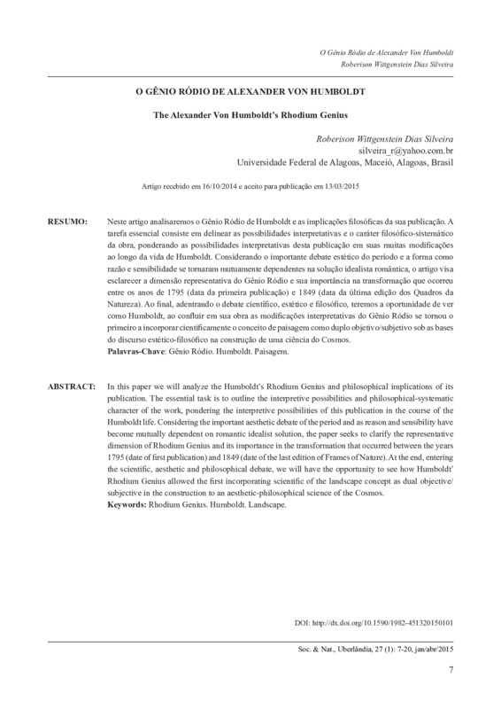 Neste artigo analisaremos o Gênio Ródio de Humboldt e as implicações filosóficas da sua publicação. A tarefa essencial consiste em delinear as possibilidades interpretativas e o caráter filosófico-sistemático da obra, ponderando as possibilidades interpretativas desta publicação em suas muitas modificações ao longo da vida de Humboldt. Considerando o importante debate estético do período e a forma como razão e sensibilidade se tornaram mutuamente dependentes na solução idealista romântica, o artigo visa esclarecer a dimensão representativa do Gênio Ródio e sua importância na transformação que ocorreu entre os anos de 1795 (data da primeira publicação) e 1849 (data da última edição dos Quadros da Natureza). Ao final, adentrando o debate científico, estético e filosófico, teremos a oportunidade de ver como Humboldt, ao confluir em sua obra as modificações interpretativas do Gênio Ródio se tornou o primeiro a incorporar cientificamente o conceito de paisagem como duplo objetivo/subjetivo sob as bases do discurso estético-filosófico na construção de uma ciência do Cosmos.