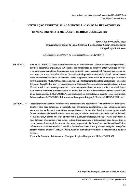 Integração territorial no mercosul: o caso da IIRSA/COSIPLAN / Territorial integration in MERCOSUR: the IIRSA/ COSIPLAN case