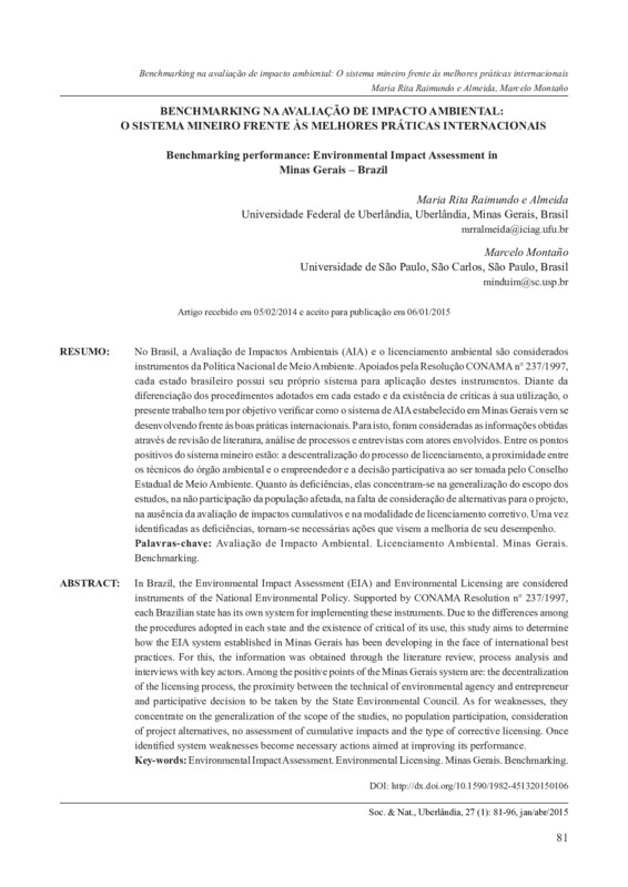 Benchmarking na avaliação de impacto ambiental: O sistema mineiro frente às melhores práticas internacionais / Benchmarking performance: Environmental Impact Assessment in Minas Gerais – Brazil