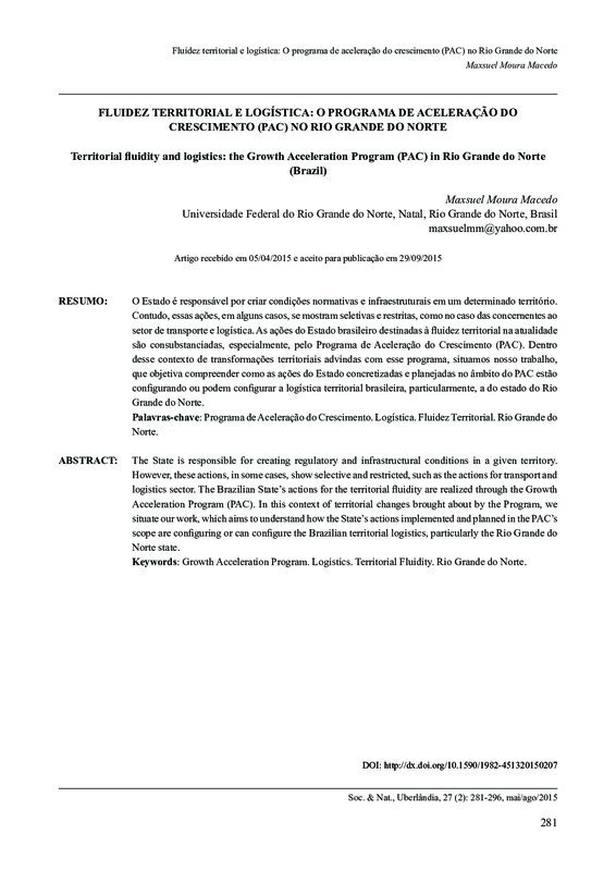 Fluidez territorial e logística: O programa de aceleração do crescimento (PAC) no Rio Grande do Norte / Territorial fluidity and logistics: the Growth Acceleration Program (PAC) in Rio Grande do Norte (Brazil)