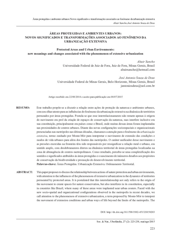 Este trabalho propõe-se a discutir a relação entre ações de proteção da natureza e ambientes urbanos. Postula-se que esse interrelacionamento não remete apenas à origem do movimento em prol da criação de espaços de conservação da natureza, mas interfere inclusive em sua constituição, principalmente em países como o Brasil, onde muitas dessas áreas foram implantadas nas proximidades de centros urbanos. Diante das novas configurações socioespaciais e organizacionais presenciadas nas metrópoles nas últimas décadas, chamamos a atenção para o fenômeno da urbanização extensiva, termo cunhado por Mont-Mór para interpretar o movimento de extensão das condições e modos de vida urbanos para além dos limites das metrópoles. O caráter unificador desse movimento e as pressões exercidas na fronteira tem sido responsáveis por ressignificar a relação rural e urbano, em sentido amplo, com desdobramentos diretos na dinâmica territorial de áreas protegidas localizadas na zona de abrangência de centros metropolitanos. Como resultado, percebe-se uma complexificação dos sentidos e significados atribuídos às áreas protegidas e o nascimento de inúmeros desafios aos propósitos de conservação da biodiversidade e promoção de desenvolvimento territorial.