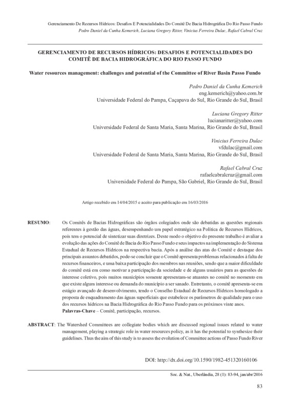 Gerenciamento de recursos hídricos: desafios e potencialidades do Comitê De Bacia Hidrográfica Do Rio Passo Fundo / Water resources management: challenges and potential of the Committee of River Basin Passo Fundo