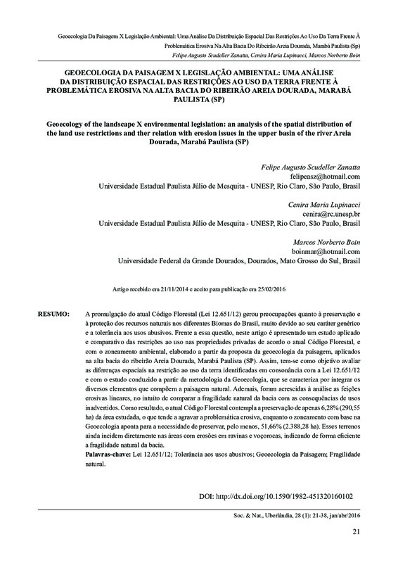 Geoecologia da paisagem X legislação ambiental: uma análise da distribuição espacial das restrições ao uso da terra frente à problemática erosiva na alta bacia do Ribeirão Areia Dourada, Marabá Paulista (SP) / Geoecology of the landscape X environmental legislation: an analysis of the spatial distribution of the land use restrictions and ther relation with erosion issues in the upper basin of the river Areia Dourada, Marabá Paulista (SP)