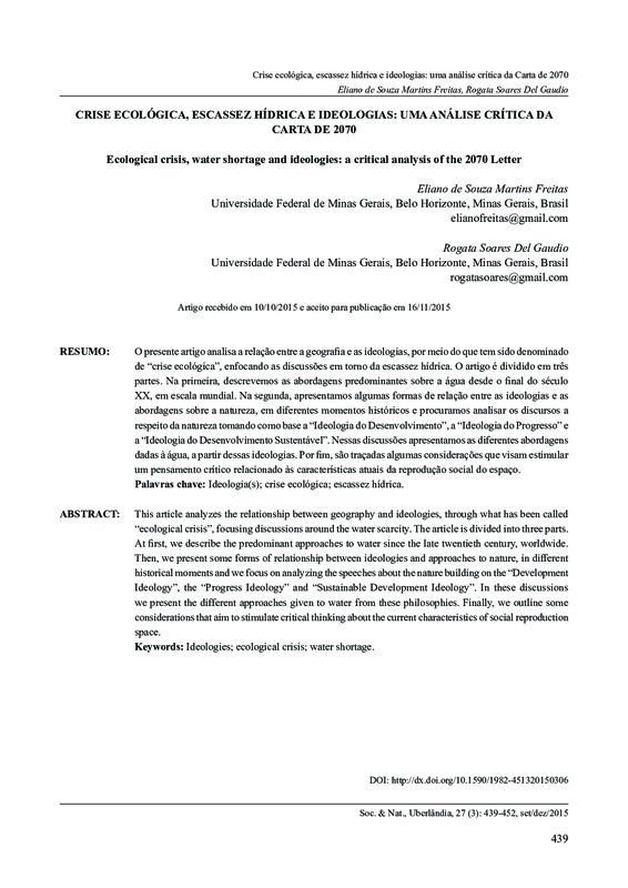 O presente artigo analisa a relação entre a geografia e as ideologias, por meio do que tem sido denominado de “crise ecológica”, enfocando as discussões em torno da escassez hídrica. O artigo é dividido em três partes. Na primeira, descrevemos as abordagens predominantes sobre a água desde o final do século XX, em escala mundial. Na segunda, apresentamos algumas formas de relação entre as ideologias e as abordagens sobre a natureza, em diferentes momentos históricos e procuramos analisar os discursos a respeito da natureza tomando como base a “Ideologia do Desenvolvimento”, a “Ideologia do Progresso” e a “Ideologia do Desenvolvimento Sustentável”. Nessas discussões apresentamos as diferentes abordagens dadas à água, a partir dessas ideologias. Por fim, são traçadas algumas considerações que visam estimular um pensamento crítico sobre as características atuais da reprodução social do espaço.