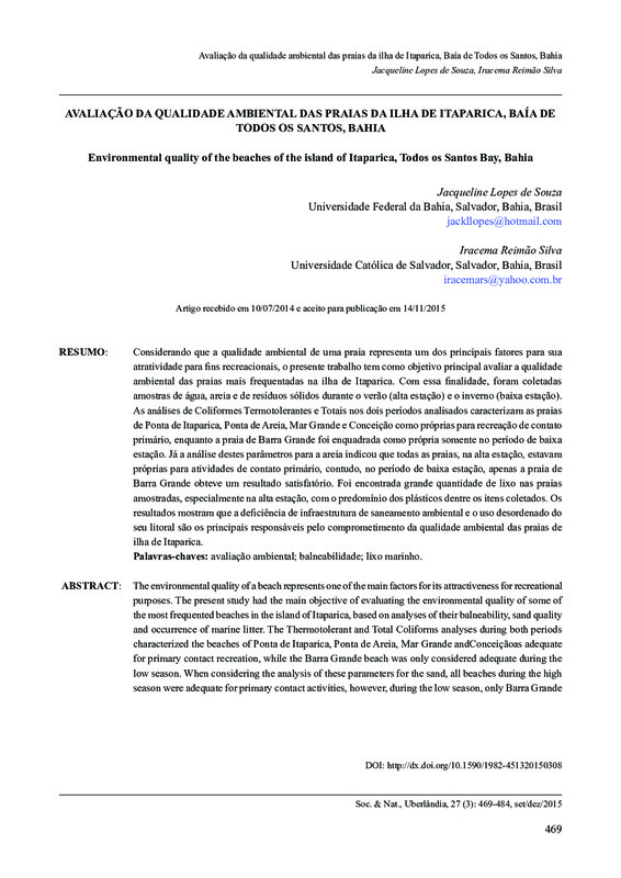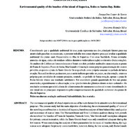 Considerando que a qualidade ambiental de uma praia representa um dos principais fatores para sua atratividade para fins recreacionais, o presente trabalho tem como objetivo principal avaliar a qualidade ambiental das praias mais frequentadas na ilha de Itaparica. Com essa finalidade, foram coletadas amostras de água, areia e de resíduos sólidos durante o verão (alta estação) e o inverno (baixa estação). As análises de Coliformes Termotolerantes e Totais nos dois períodos analisados caracterizam as praias de Ponta de Itaparica, Ponta de Areia, Mar Grande e Conceição como próprias para recreação de contato primário, enquanto a praia de Barra Grande foi enquadrada como própria somente no período de baixa estação. Já a análise destes parâmetros para a areia indicou que todas as praias, na alta estação, estavam próprias para atividades de contato primário, contudo, no período de baixa estação, apenas a praia de Barra Grande obteve um resultado satisfatório. Foi encontrada grande quantidade de lixo nas praias amostradas, especialmente na alta estação, com o predomínio dos plásticos dentre os itens coletados. Os resultados mostram que a deficiência de infraestrutura de saneamento ambiental e o uso desordenado do seu litoral são os principais responsáveis pelo comprometimento da qualidade ambiental das praias de ilha de Itaparica.