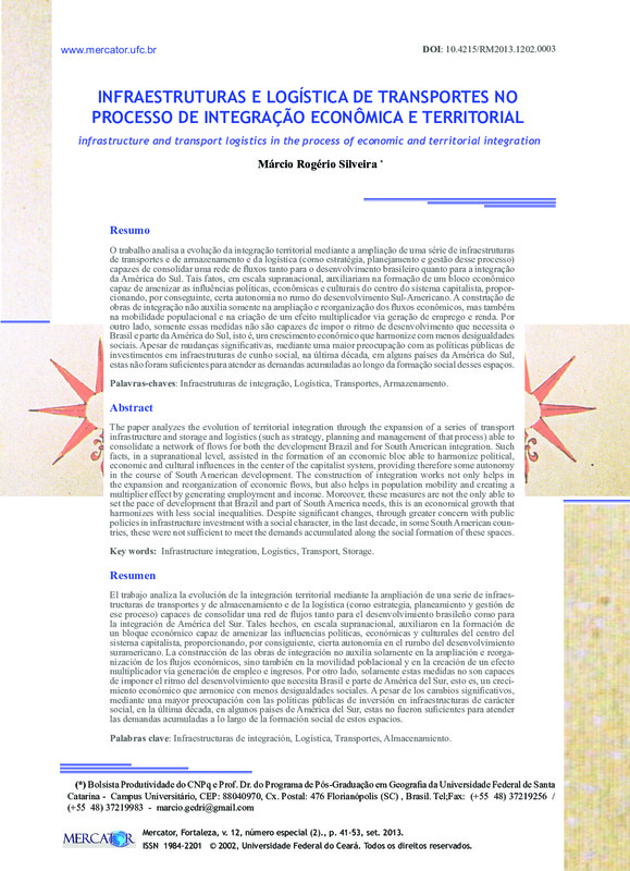 INFRAESTRUTURAS E LOGÍSTICA DE TRANSPORTES NO PROCESSO DE INTEGRAÇÃO ECONÔMICA E TERRITORIAL (infrastructure and transport logistics in the process of economic and territorial integration)