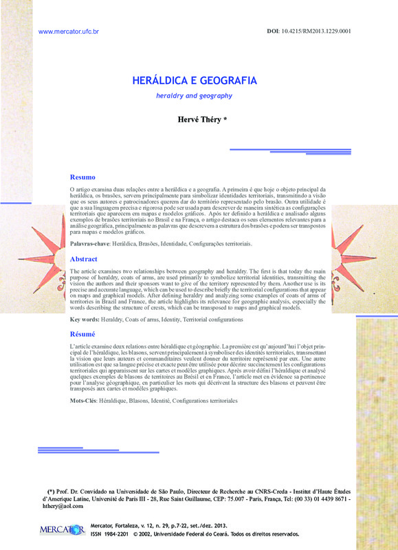 O artigo examina duas relações entre a heráldica e a geografia. A primeira é que hoje o objeto principal da