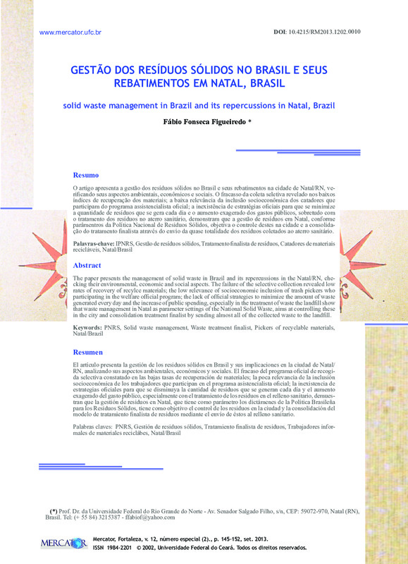 GESTÃO DOS RESÍDUOS SÓLIDOS NO BRASIL E SEUS REBATIMENTOS EM NATAL, BRASIL (solid waste management in Brazil and its repercussions in Natal, Brazil)