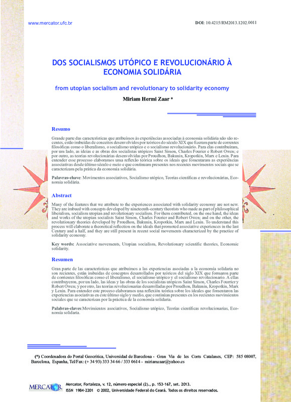 DOS SOCIALISMOS UTÓPICO E REVOLUCIONÁRIO À ECONOMIA SOLIDÁRIA (from utopian socialism and revolutionary to solidarity economy)