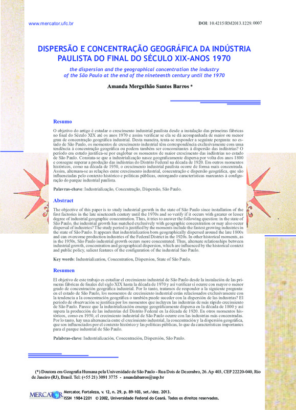DISPERSÃO E CONCENTRAÇÃO GEOGRÁFICA DA INDÚSTRIA PAULISTA DO FINAL DO SÉCULO XIX-ANOS 1970 (the dispersion and the geographical concentration the industry of the São Paulo at the end of the nineteenth century until the 1970)