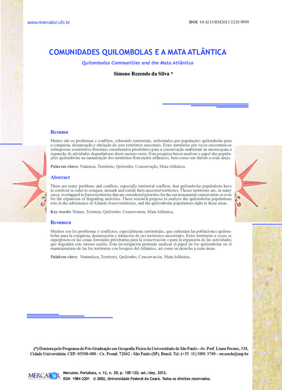 ções quilombolas na manutenção dos territórios florestados atlânticos, bem como seu direito a estas áreas.