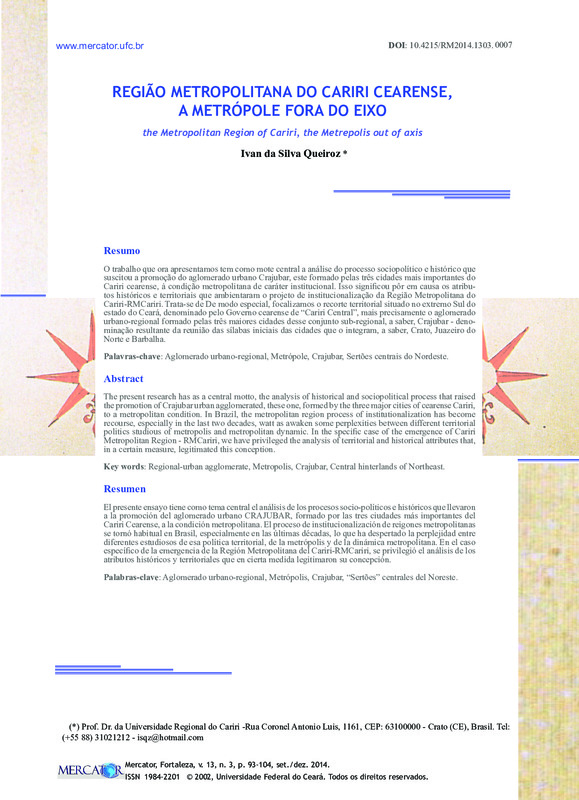 Cariri cearense, à condição metropolitana de caráter institucional. Isso significou pôr em causa os atribu-