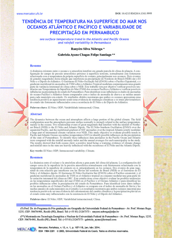 TENDÊNCIA DE TEMPERATURA NA SUPERFÍCIE DO MAR NOS OCEANOS ATLÂNTICO E PACÍFICO E VARIABILIDADE DE PRECIPITAÇÃO EM PERNAMBUCO (sea surface temperature trend in the Atlantic and Pacific Oceans and rainfall variability in Pernambuco)