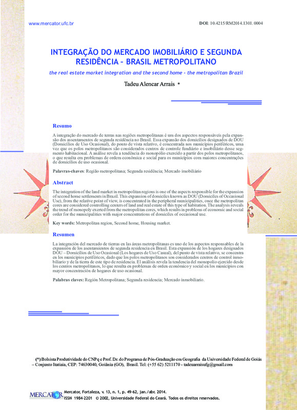INTEGRAÇÃO DO MERCADO IMOBILIÁRIO E SEGUNDA RESIDÊNCIA – BRASIL METROPOLITANO (the real estate market integration and the second home - the metropolitan Brazil)